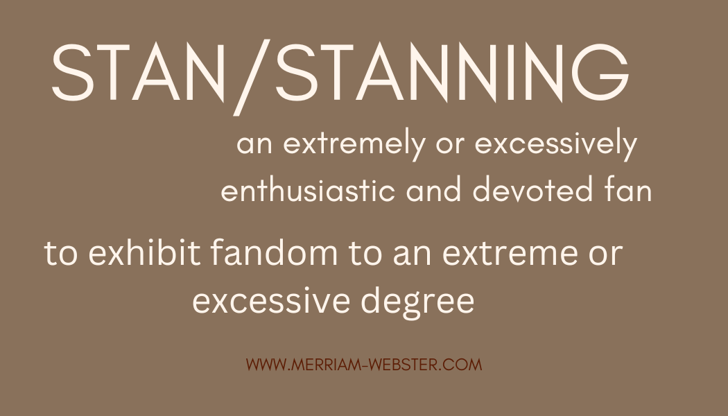 A stan is the new word for what used to be referred to as an obsessed fan. It has always been around and we have always used these characters in stories; we just found another word for them. Believe it or not, I do see this word becoming obsolete, or it’s meaning changing over time. Questioning it’s sustainability aside, I would not use “stan” or “stanning” in my storytelling because I can see future generations remiss by the context. That is not to say it wouldn’t make for great storytelling when used today.