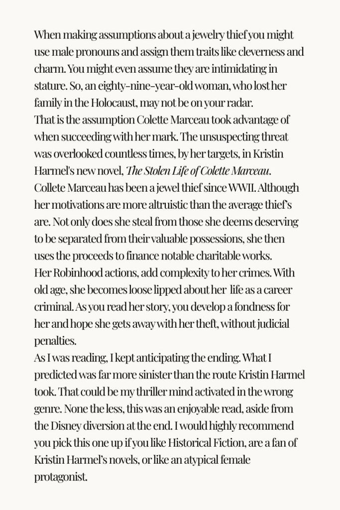 Written by Tameka FlemingJuly 16, 2025July 13, 2025 Kristin Harmel puts a spin on the Robinhood Tale, Using A Holocaust Survivor and Octogenarian in The Stolen Life of Colette Marceau Share this: Click to share on X (Opens in new window) X More Click to share on Pinterest (Opens in new window) Pinterest Like Loading... Related Leave a comment Cancel reply Δ